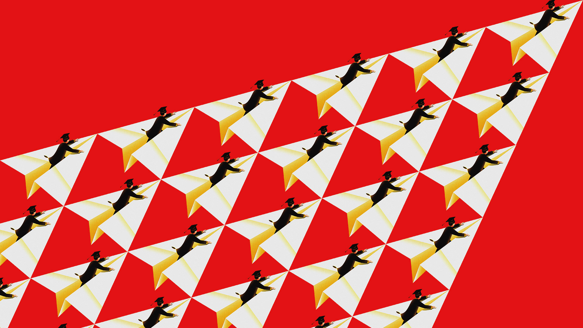 The editorial illustration depicts a graduate riding a paper plane, representing dreams taking flight and new beginnings.